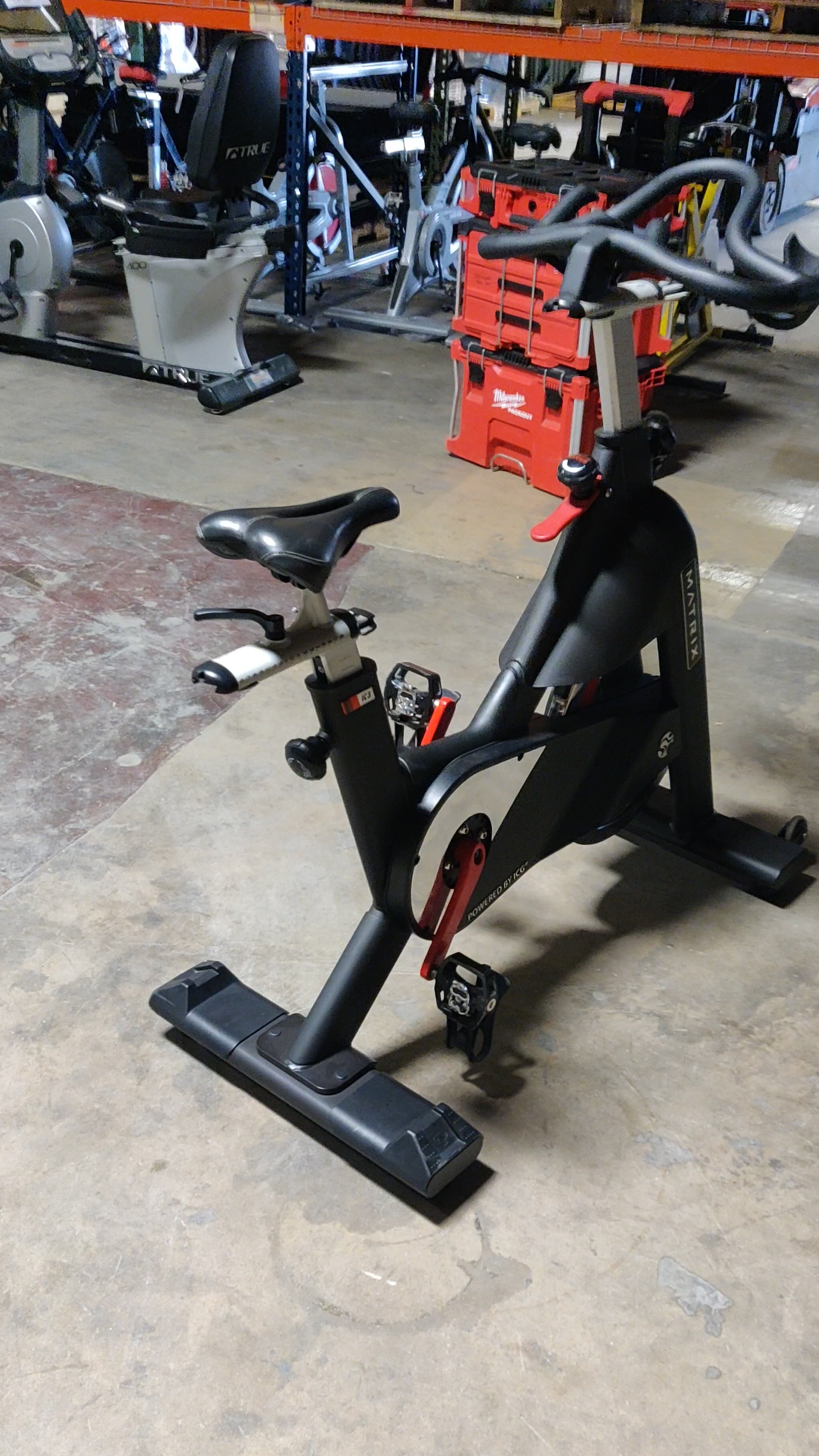 Matrix upright indoor exercise cycle bike with flywheel, a great machine for indoor cycle classes and all sorts of aerobic workouts.
